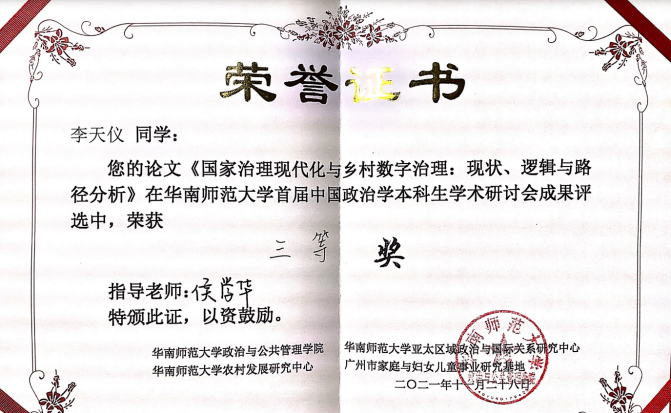2021年11月28日,由华南师范大学best365、农村发展研究中心、亚太区域政治与国际关系研究中心及广州市家庭与妇女儿童事业研究基地联合主办的华南师范大学首届中国政治学本科生学术研讨会暨国家级一流专业政治学本科生科研创新经验交流研讨会在线上召开。公司本科生李天仪参加全国性学术研讨会并做题为《国家治理现代化与乡村数字治理:现状、逻辑与路径分析》的论文汇报。这篇论文在best365经理侯学华教授指导下完成。
