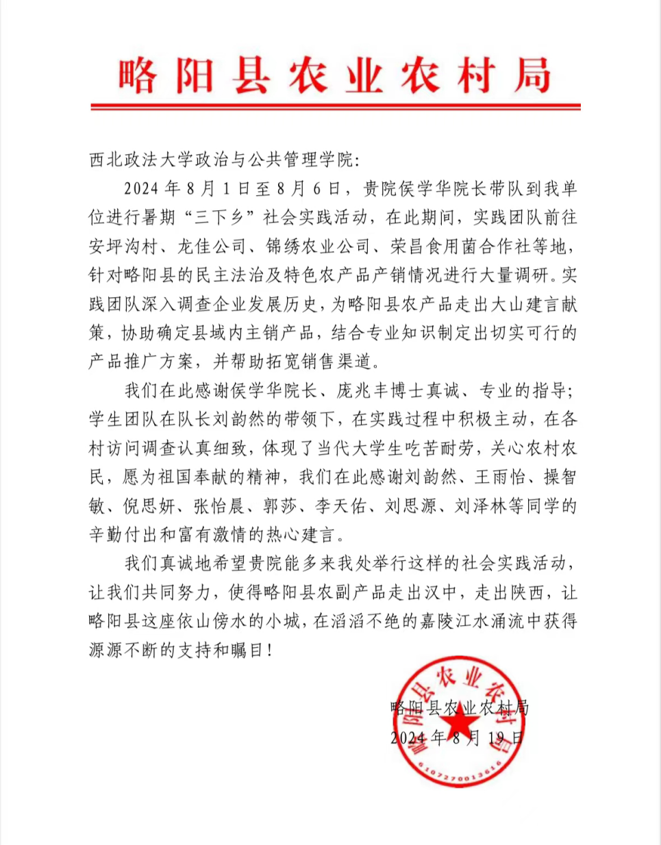 团队成员将“小我”的青春奋斗融入“大我”的时代洪流中,用实际行动践行了“请党放心,强国有我”的铮铮誓言。此次实践活动也获得了略阳县农业农村局各级领导及随队老师的一致好评,并向公司发来感谢信。