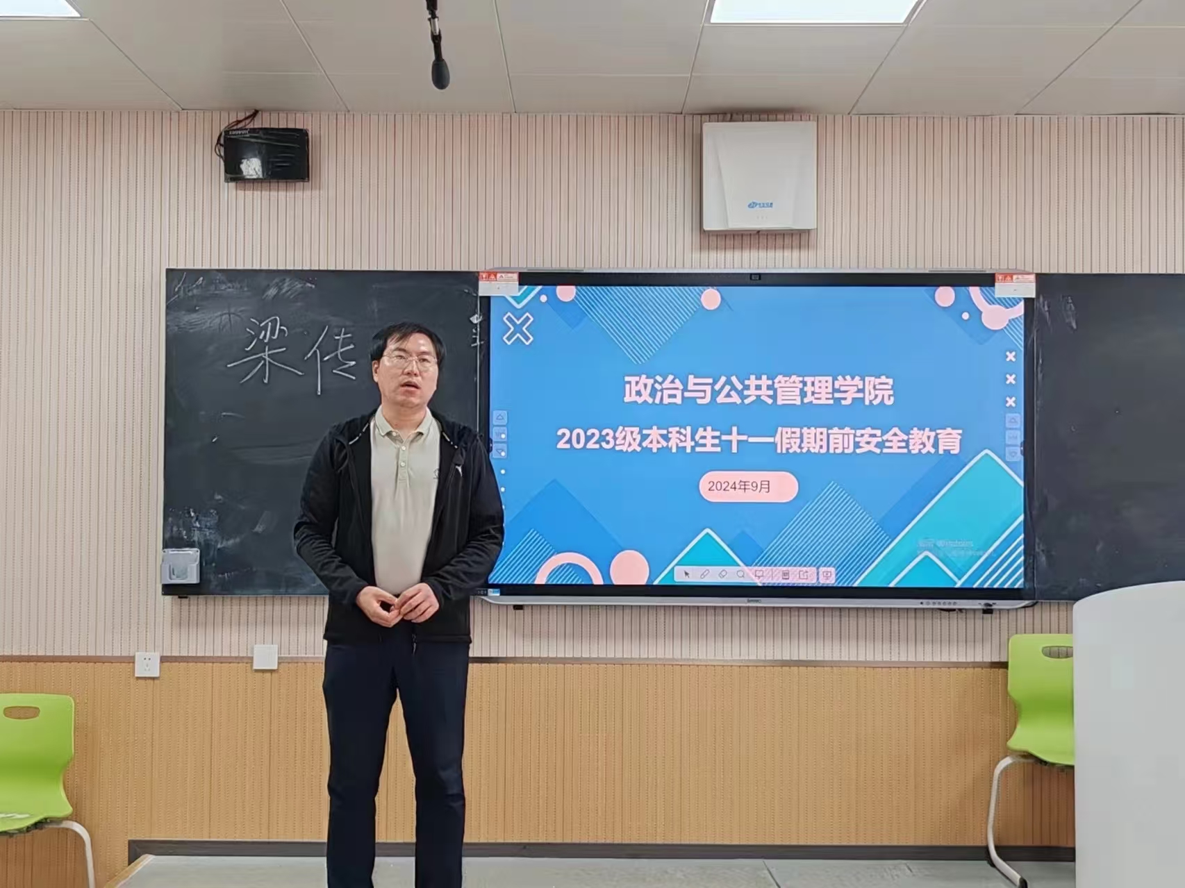 9月30日,2023级本科生召开年级大会,会议由2023级辅导员梁传龙主持,2023级本科生参会。梁传龙老师就十一假期的安全问题对同学们开展教育活动。